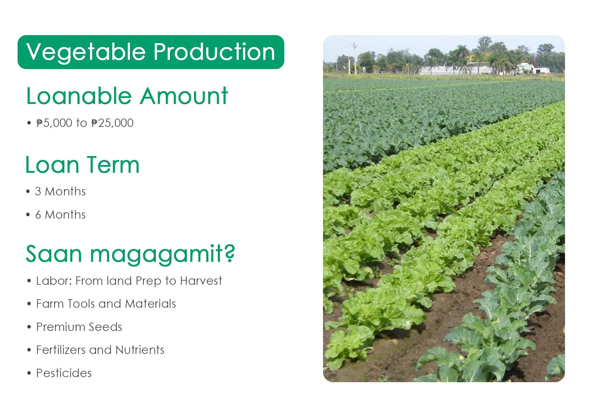 - Abot-kayang Interest Rate – Hindi pabigat sa pang-agrikulturang hanapbuhay.
