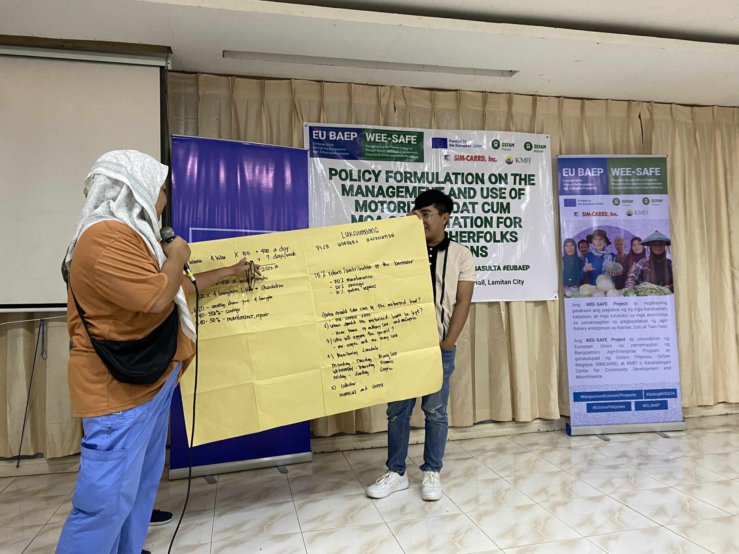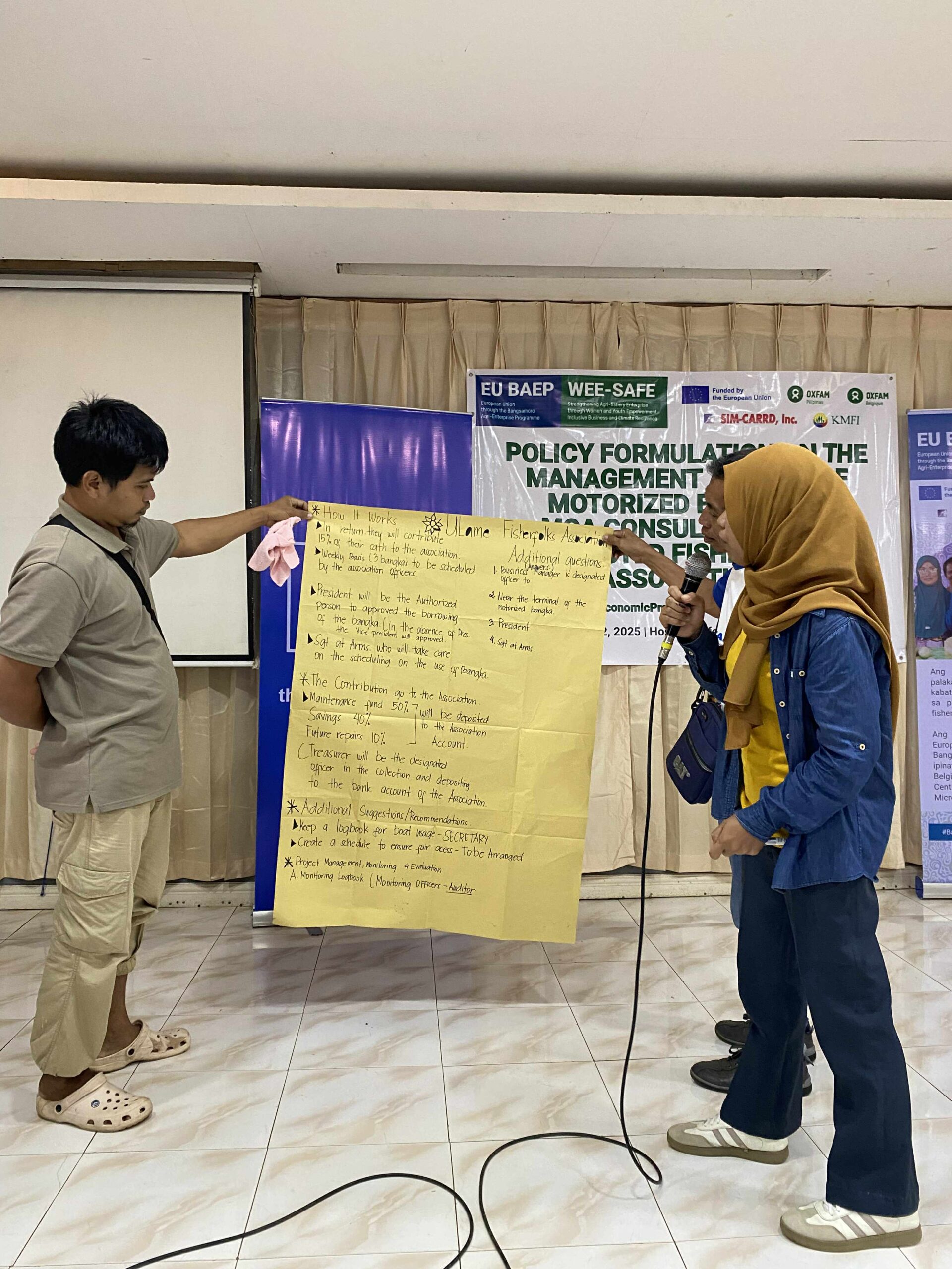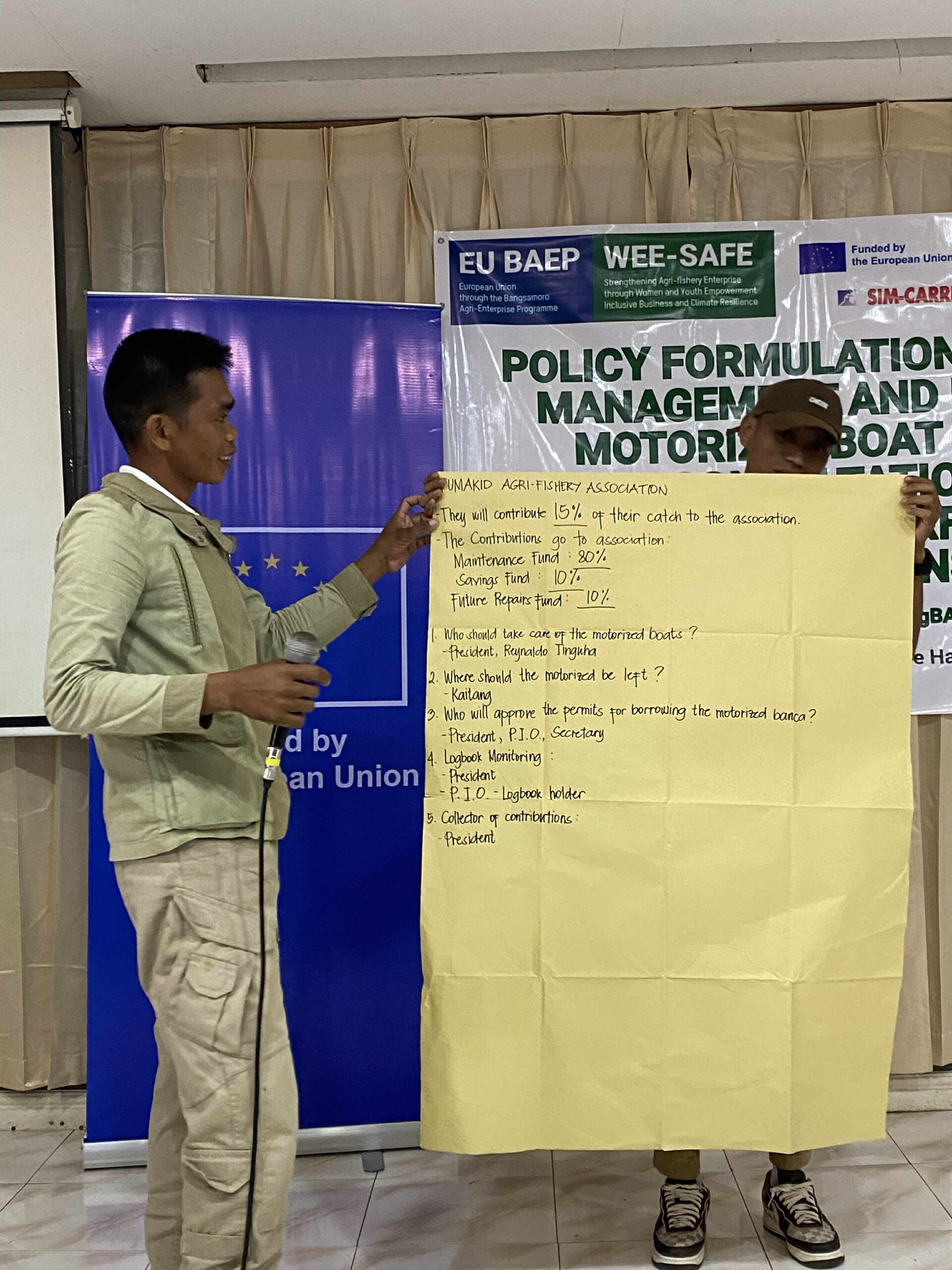 The Policy Formulation in the Management and Use of Motorized Boats cum MOA Consultation for Fisherfolk Associations was conducted on November 12, 2025, at the Hostel Conference Hall, Barangay Matibay, Lamitan City. The activity aimed to guide fisherfolk associations in drafting clear Policies, Systems, and Procedures (PSP) for the equitable, sustainable, and accountable use of 14 motorized boats provided by the project. During the workshop, participating associations developed and presented PSPs detailing boat usage schedules, contribution systems, maintenance responsibilities, and financial accountability mechanisms. The session also included a detailed orientation on the Memorandum of Agreement (MOA), clarifying the obligations of both the project and the associations to ensure transparency, collective benefit, and long-term sustainability. The activity concluded with commitments to finalize the PSPs, conduct internal re-echo sessions, schedule boat testing, and hold official MOA signing and turnover ceremonies, reinforcing the WEE-SAFE Project’s goal of empowering fisherfolk through organized, sustainable, and accountable resource management.